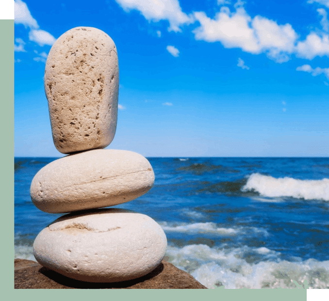 A stack of rocks on top of each other near the ocean.